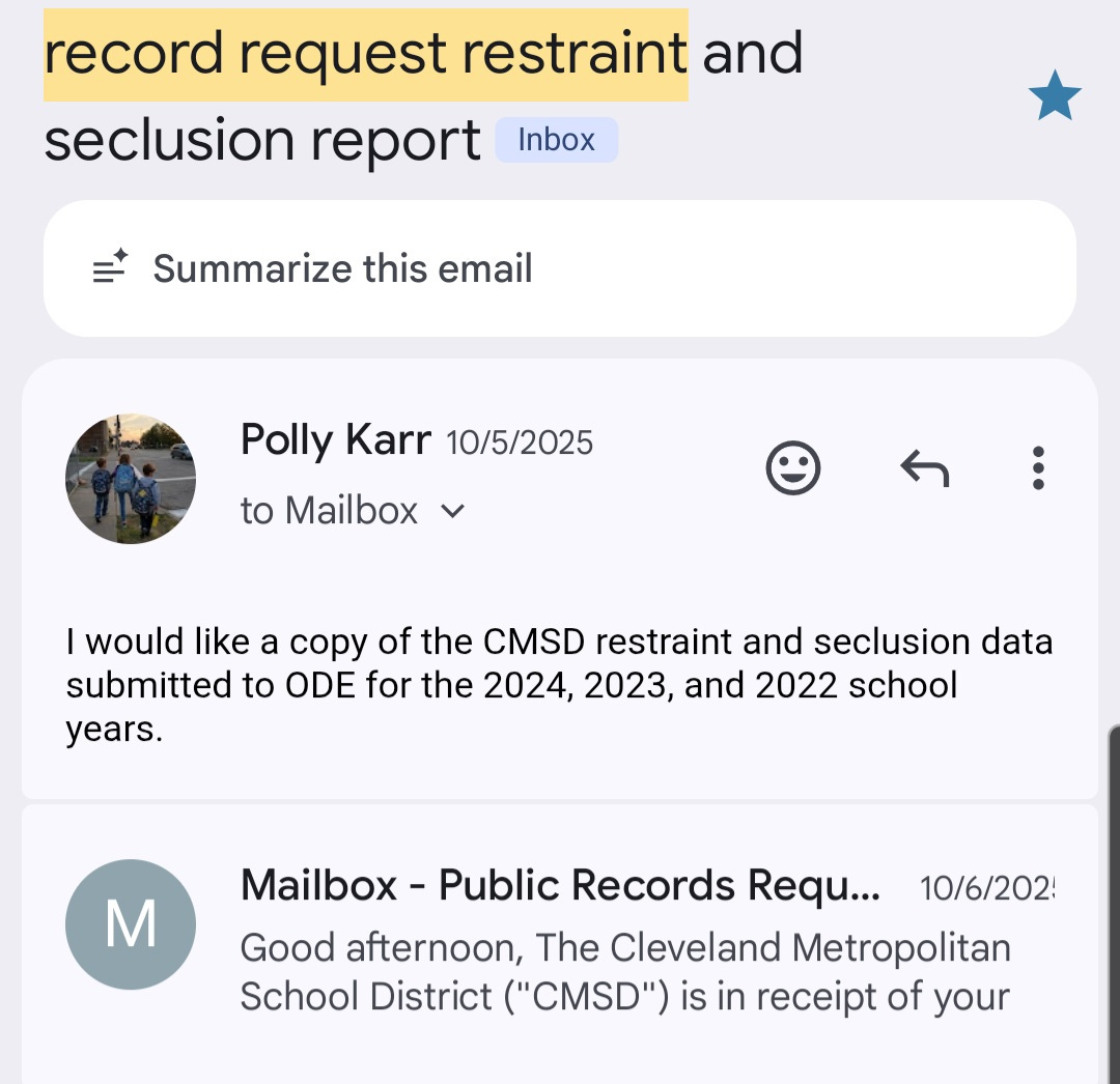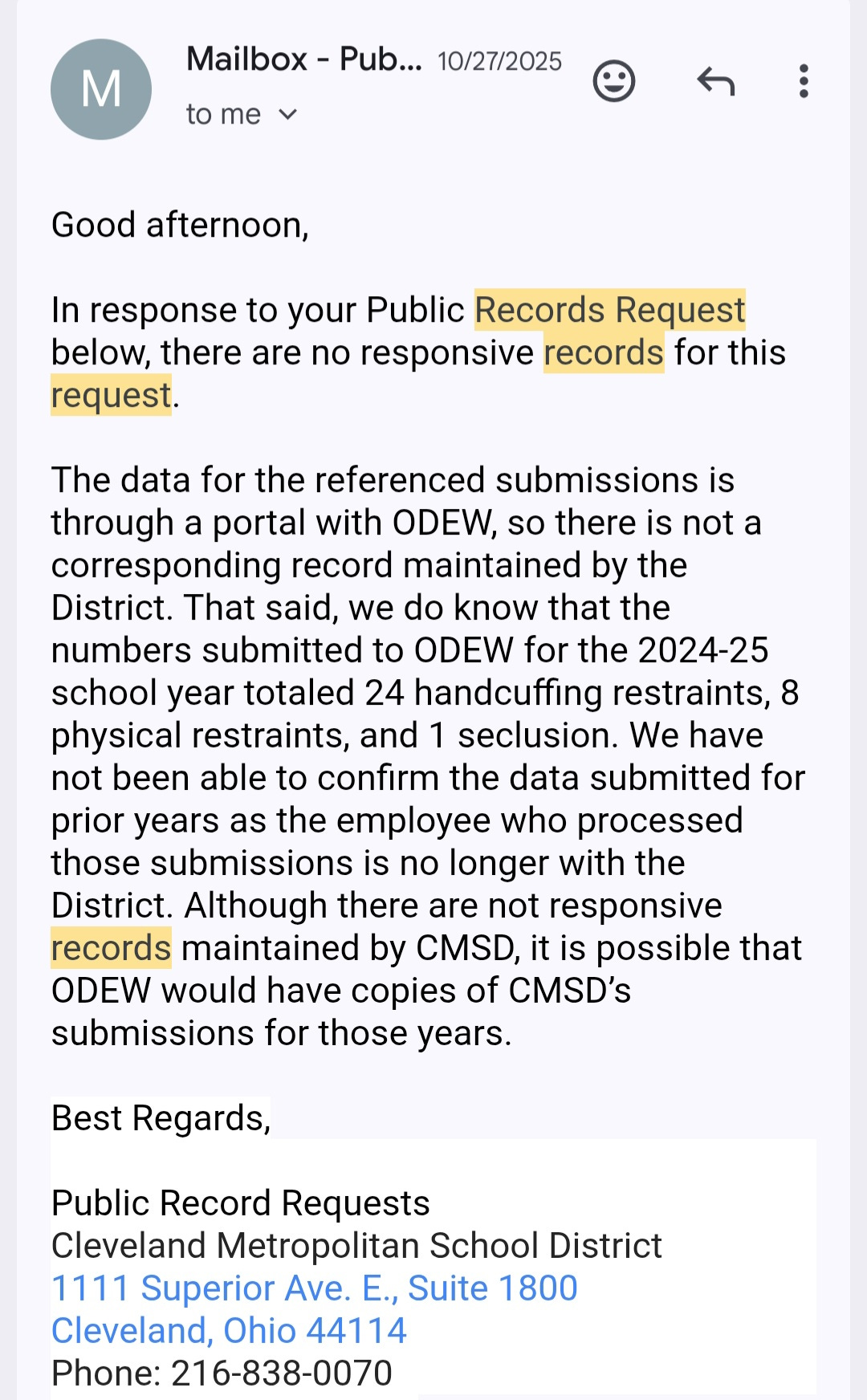 In addition to copies of the documents I have received, I have also included in the file screen shots from email exchanges with the legal department of CMSD. Sometimes they don’t give me documents but do give me conversational answers to my requests. Here is an example: