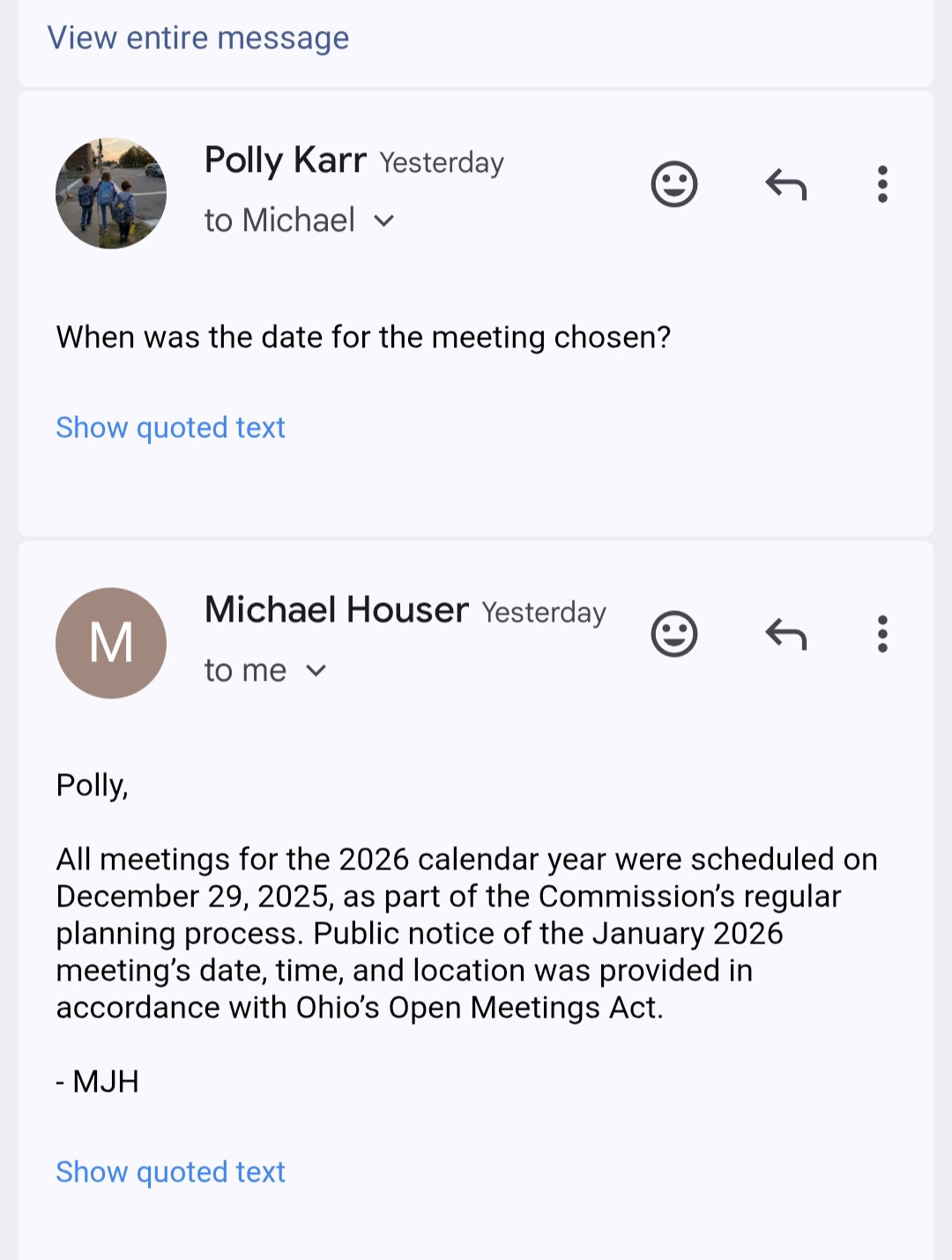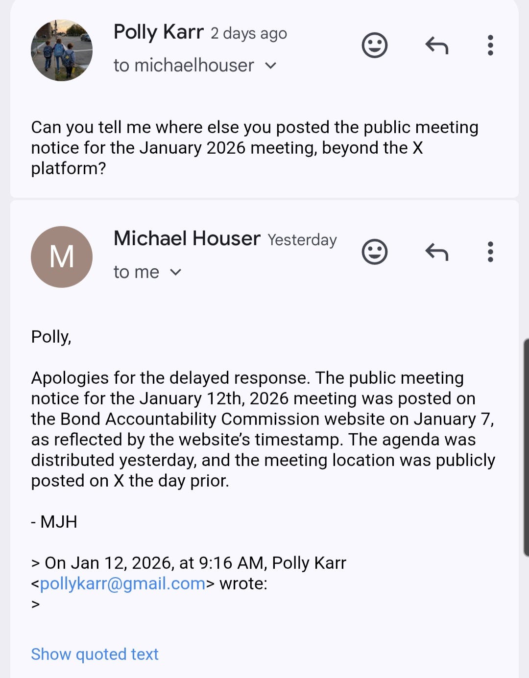It wasn’t quite 24 hours notice, but it was the required public notice, so there’s that. I couldn’t find any other announcement of the meeting anywhere else. Just Twitter for their 503 followers. They have a website but it’s kind of awful and it’s difficult to know if anything is current. I did use it to find an email address for commission member Michael Houser so I took the opportunity to ask him some questions.