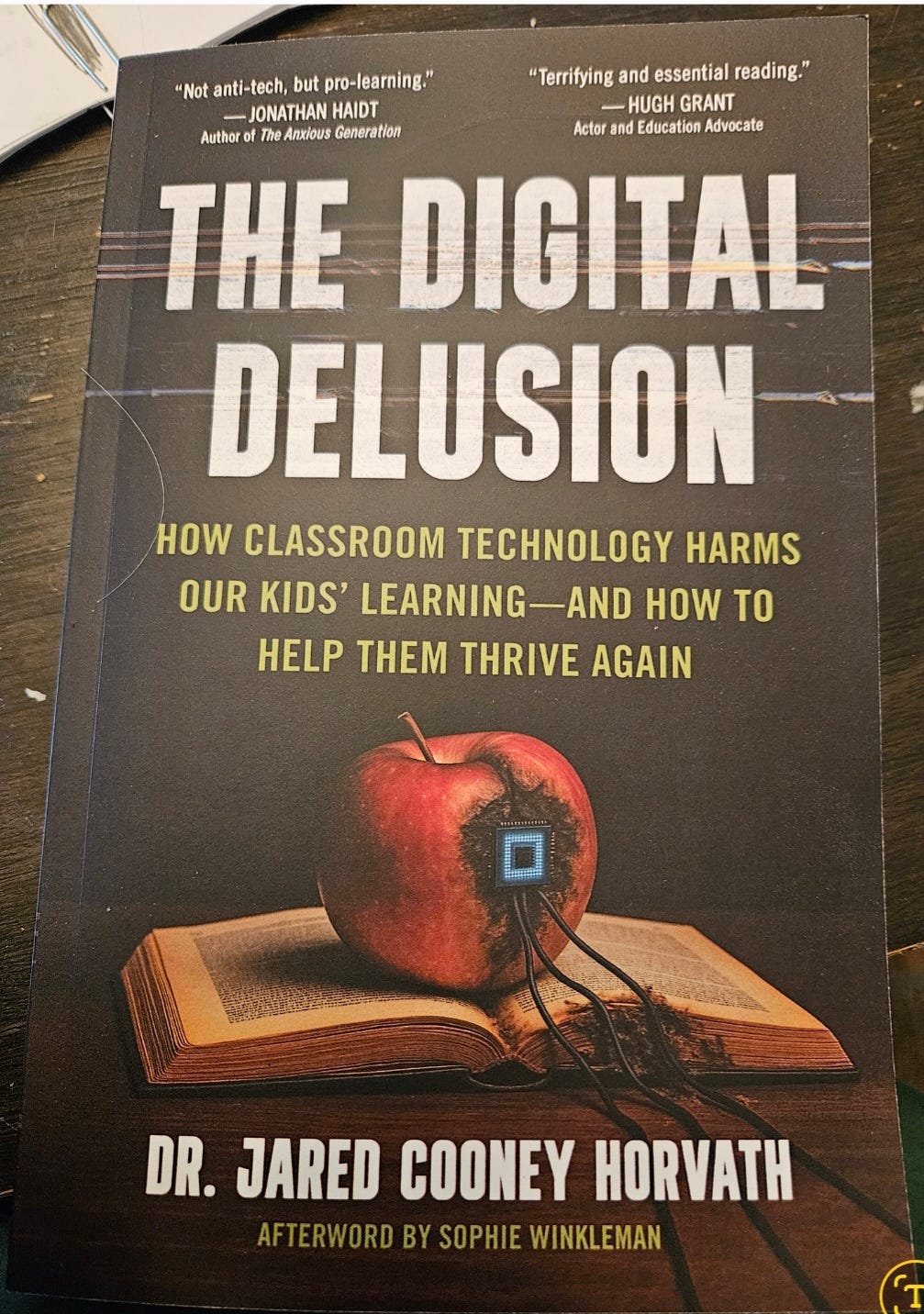 Trying something new here. I love podcasts and one of my favorites is called Chalk & Talk with Anna Stokke. She is a Canadian math teacher but she interviews math instruction experts from around the world. I recommend the podcast overall but particularly episode 62, “Why classroom technology is making students learn less,” during which Stokke interviews Dr. Jared Cooney Horvath about his new book, “The Digital Delusion.” It is a great episode and I paused midway through to order the book. I’ve been reading it the past few days and it is alarming but good. My 6th grade son, Jonah, also loves books like this so when I can’t locate it by the sofa, I know to go look for it on his bedside table.