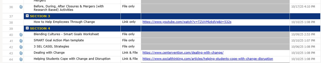 To keep a worried and stressed out staff in line, The Playbook has lots of links in the Resources file dedicated to dealing with change. Principals are directed to watch You Tube videos for guidance on making their staff adapt to the mergers.